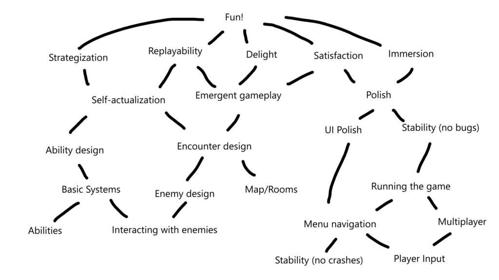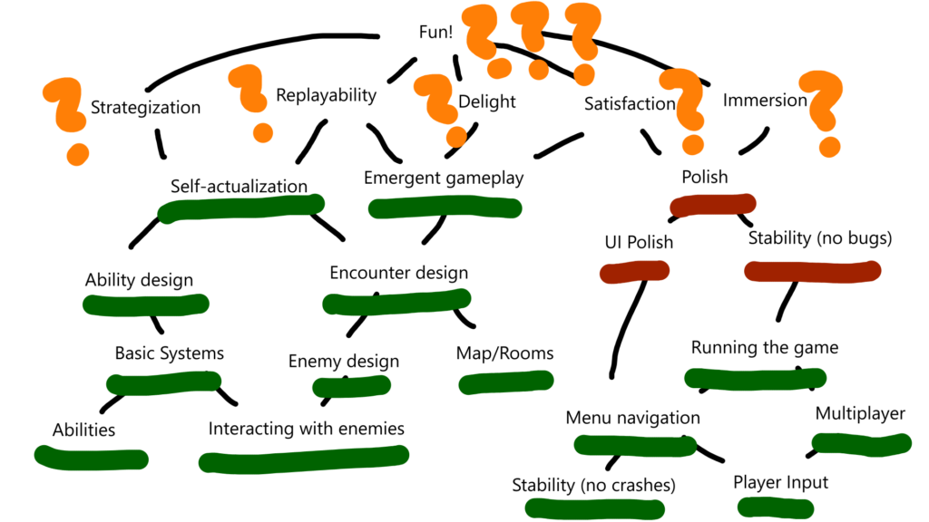 As you can see, more basic questions like “Does the game not crash?” and “Can I navigate the menu to get to the game?” are answered near the bottom. These build up to intermediate questions like “What do encounters look like?” and “Can I play the game without gameplay-breaking bugs?”. Eventually, we get to very high-level, engaging questions like “What choices can I make to express my gameplay?” or “How can I do this differently next time?”.