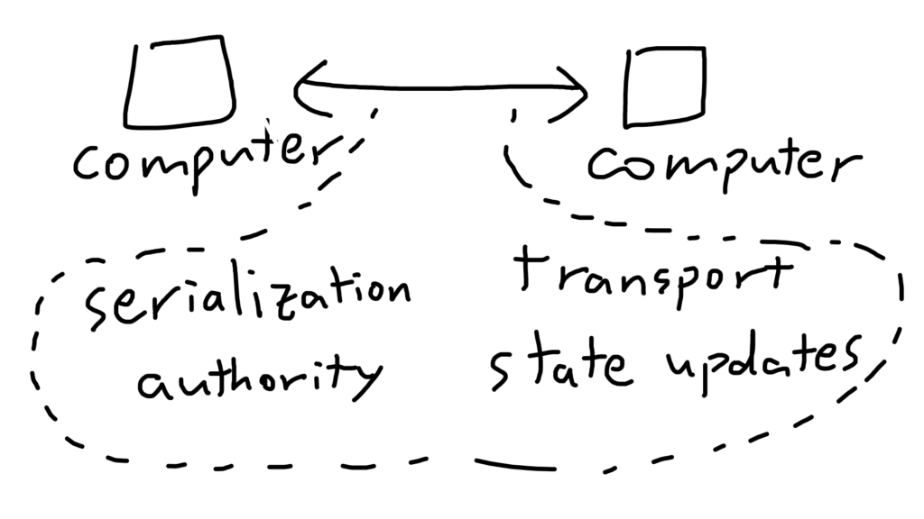 First, let’s back up and talk about what we need for a multiplayer game over the internet. Essentially, we need for two computers in different places to look convincingly similar enough that the people playing on those computers think they’re looking at the same thing. However, those two computers are typically separated by distance, and, more crucially, by time. How do we make those two computers look alike enough even when they can’t talk to each other immediately?